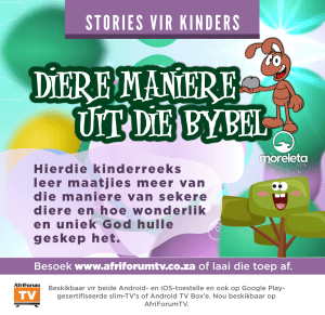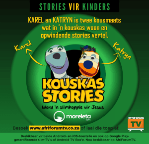 Jy kan dit kry deur www.afriforumtv.co.za te besoek. Die toep op jou selfoon af te laai. Dit kan ook op jou televisie afgelaai word as dit ’n Google Play-gesertifiseerde slim-TV is. Dit is dan ook beskikbaar op verskeie TV Box’e. - AfriKinders is ’n gratis toep met ’n verskeidenheid Afrikaanse inhoud vir kinders tussen die ouderdom 2 en 13. Jy kan die toep aflaai op jou selfoon en kinders kan dan veilig net na die kinderinhoud kyk.