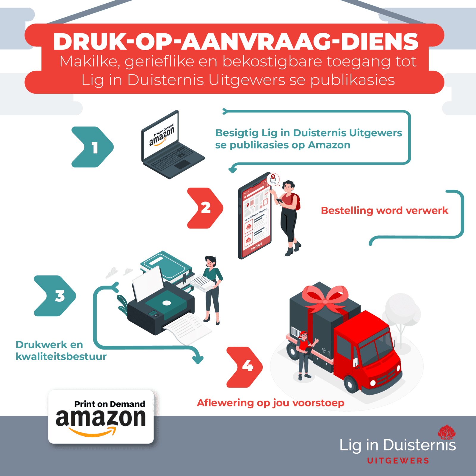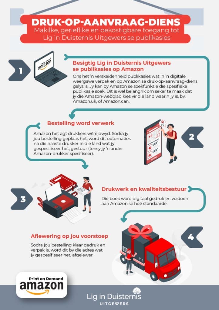 Met Amazon se druk-op-aanvraag-diens kan jy, en jou geliefdes in die buiteland, LIDU-publikasies sonder invoerkoste aankoop. Of jy net die afstand tussen jou en jou geliefdes met ‘n kosbare geskenk wil verklein, en of jou vriende in die buiteland op groot maat vir Bybelstudiegroepe wil bestel, die druk-op-aanvraag-diens het geen beperking op die hoeveelheid boeke wat bestel of gedruk word nie. Sodoende kan jy moeiteloos ʼn LIDU-publikasie op die druk-op-aanvraag-diens bestel.