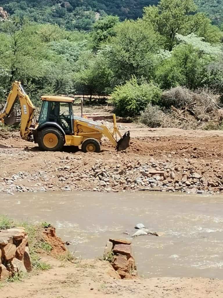 Jannie van Zyl, van die firma JCD Vervoer op Brits, het onverpoosd met sy laaigraaf gewoeker om ’n tydelike damwal tot stand te bring en die rivier te tem. Dié kragtige masjien kan normaalweg teen R500 per uur gehuur word, maar Jannie het self het baie ure ingesit om die werk gratis te verrig.