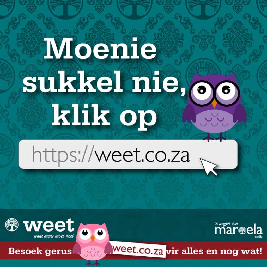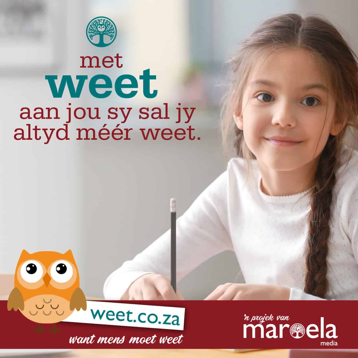 Weet.co.za, ʼn e-naslaangids onder die vaandel van Maroela Media, spog met ʼn wye verskeidenheid onderwerpe, wat onder andere ook die kurrikulumonderwerpe van graad 4 tot 7 dek. Ons spog met ʼn ywerige span skrywers, kundiges en taalversorgers wat al die moeilike werk reeds gedoen het en gehalte Afrikaans artikels beskikbaar stel sodat lesers betroubare inligting sal ontvang.