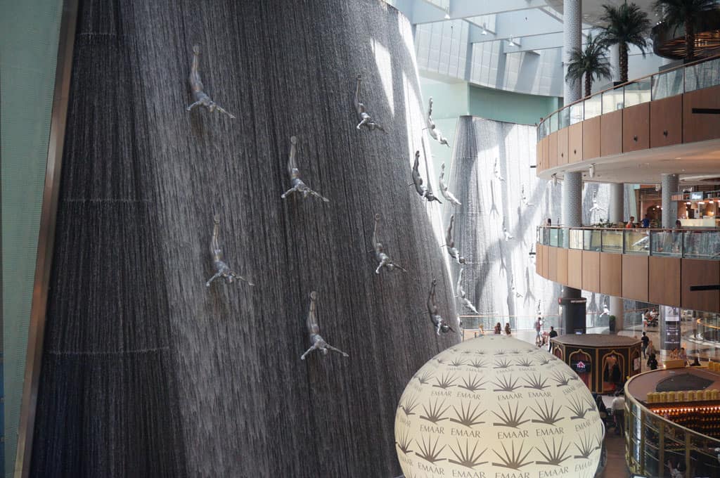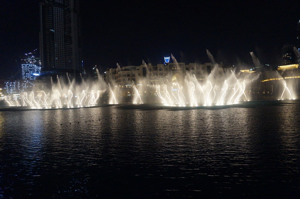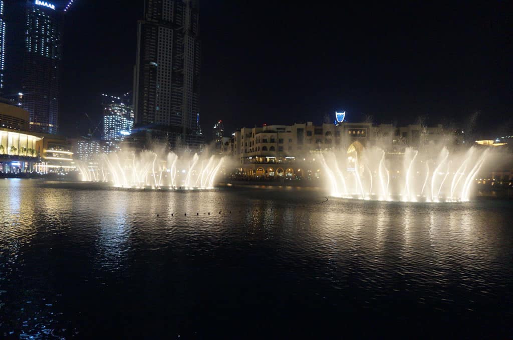 Buite word ons deur die Dubai-waterfonteine vermaak. Die Dubai-fontein spuit water so hoog as 500 voet (of 152,4 m) in die lug op – so hoog soos ’n 50 verdieping-gebou! Dis ontwerp deur die skeppers van die Fonteine van Bellagio in Las Vegas en is van elke punt op die promenade en van baie naburige strukture sigbaar. Die uitvoerings vind om 13:00 en om 13:30 plaas, asook elke 30 minute van 18:00 tot 22:00 op weeksdae en van 18:00 tot 23:00 oor die naweke (naweke hier is Donderdag, Vrydag en Saterdag). Dit was die eerste keer wat ek die Dubai-fontein te siene gekry het en ek was verbaas oor sy waterdansvertoning. Die keuse van die musiek self is ongelooflik. Woorde en foto’s kan dit regtig nie beskryf nie. Ek beveel ’n besoek aan hierdie fonteine by enigiemand aan wat Dubai besoek.