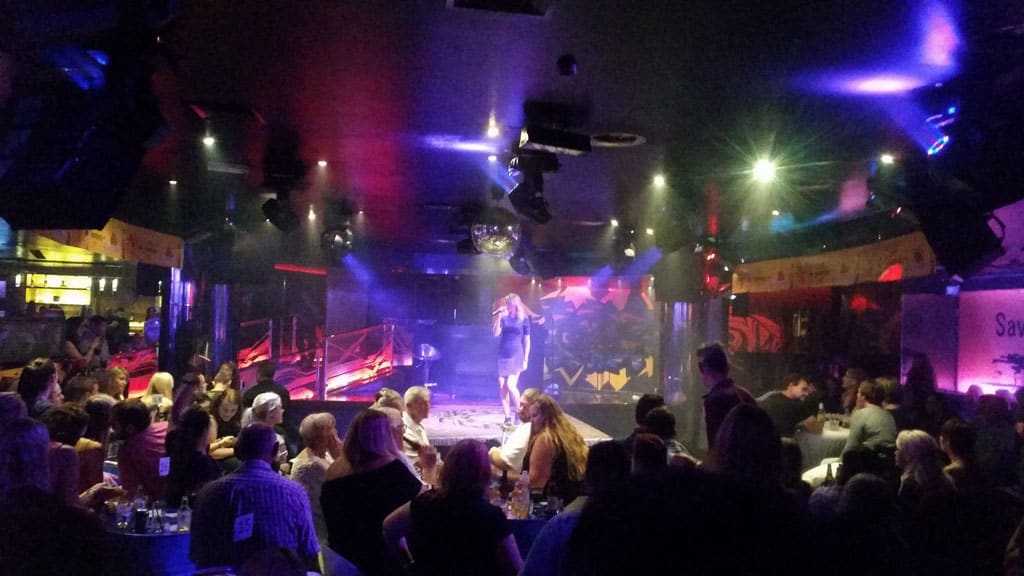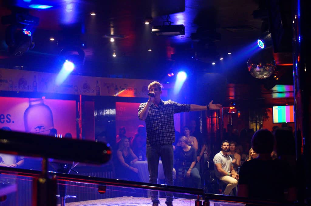 Op die oop verhoog in die middel kom ’n man met ’n wye hoepelrok opgestap. Hy draai in die rondte en sy rok draai saam: al hoër totdat dit tot by sy nek draai. Tot ons almal se verbasing skakel hy skielik die rok se liggies aan!